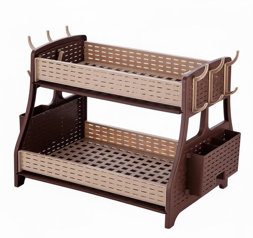 punkto. 2-stöckiges Geschirrabtropfgestell – Großes Abtropfgestell für Küche mit Besteckkorb, 6 Haken & 2 Abtropfschalen – BPA-freier Geschirrständer im modernen Hasir-Design – Braun – 50 x 30 x 34 cm