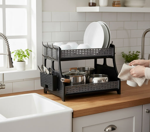 Auf Lager🍽️ 2-stöckiges Abtropfgestell für maximale KapazitätDas praktische Geschirrabtropfgestell mit zwei Ebenen bietet viel Platz für Teller, Tassen, Glä...